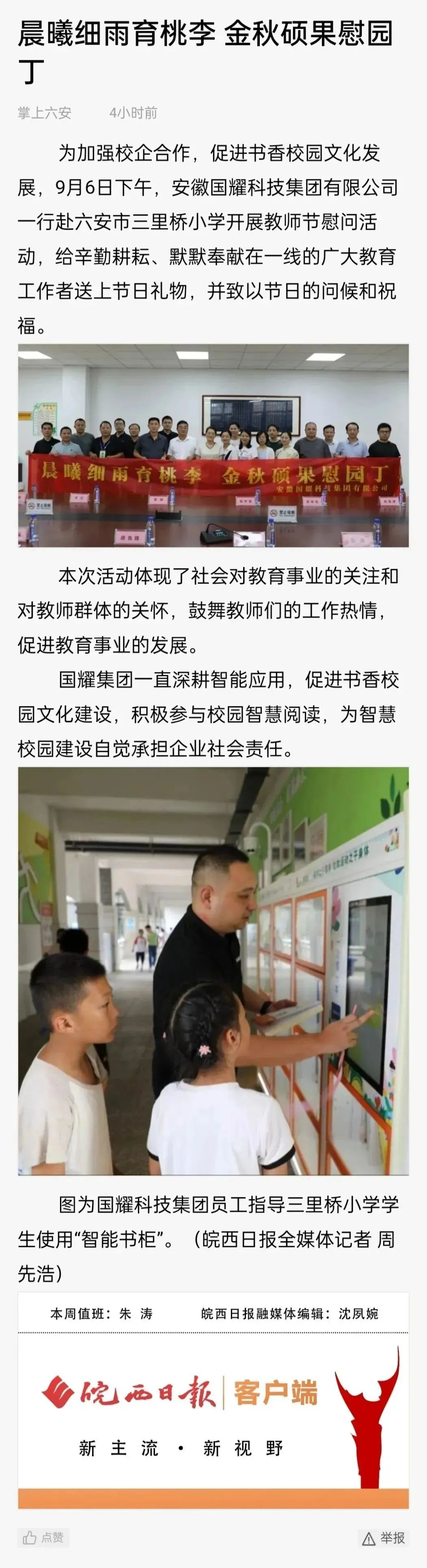 國耀公司致力于通過智能應用促進書香校園文化建設,提升智慧校園高速發(fā)展,積極參與校園智慧閱讀,為智慧校園建設自覺承擔企業(yè)社會責任。通過這次活動,不僅表達了國耀科技集團對教育工作者的敬意,加強了校企共建書香校園的交流,更讓老師們感受到社會的關心和支持。