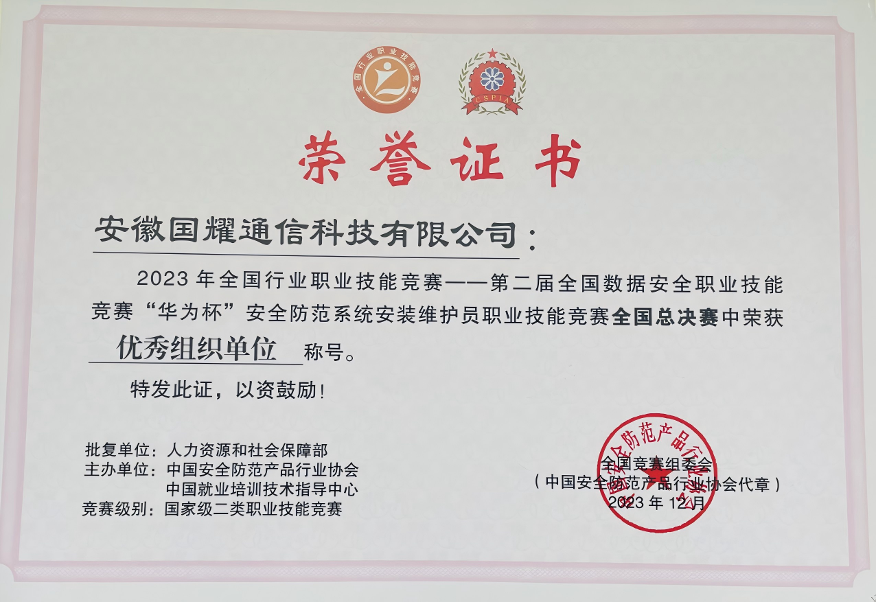 這些獎項不僅僅是一份榮譽,更是對國耀通信在數據安全領域的高度認可。它標志著國耀通信在安全防范系統安裝維護方面達到了領先水平,為行業(yè)樹立了標桿。同時,也激勵著國耀通信在未來的發(fā)展道路上,繼續(xù)砥礪前行,為保障數據安全、推動行業(yè)發(fā)展貢獻更多的力量。