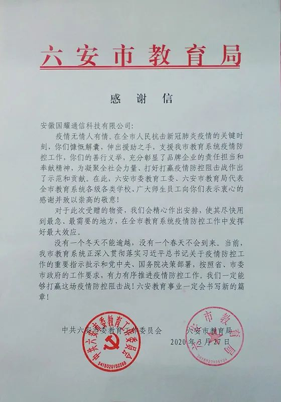 2020年初,新型冠狀病毒肺炎疫情洶涌來(lái)襲,給人民群眾生活帶來(lái)嚴(yán)重影響。此次疫情也牽動(dòng)著安徽國(guó)耀通信科技有限公司全體人員的心。能為全市教育事業(yè)盡一點(diǎn)綿薄之力是每一個(gè)有責(zé)任感的企業(yè)應(yīng)該做的,相信在社會(huì)各界的廣泛關(guān)注和支持下,我市各級(jí)教育部門(mén)一定能夠打贏這場(chǎng)疫情防控阻擊戰(zhàn),守護(hù)校園平安,切實(shí)保障師生的生命健康安全。