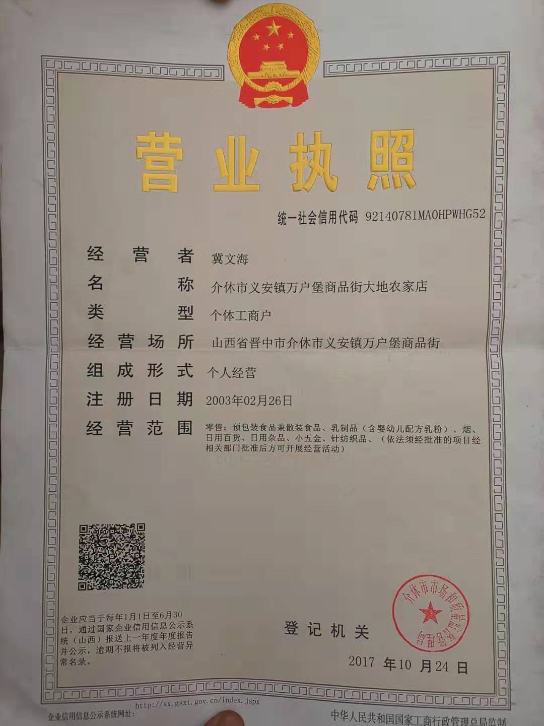 商店名稱:介休市義安鎮(zhèn)萬戶堡商品街大地農(nóng)家店