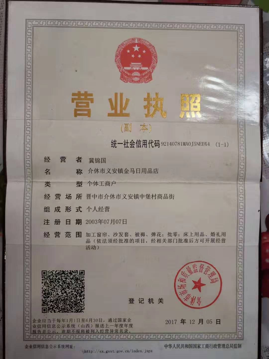 經(jīng)營(yíng)范圍:加工窗簾、沙發(fā)套、被褥、彈花;批零床上用品、婚禮用品等