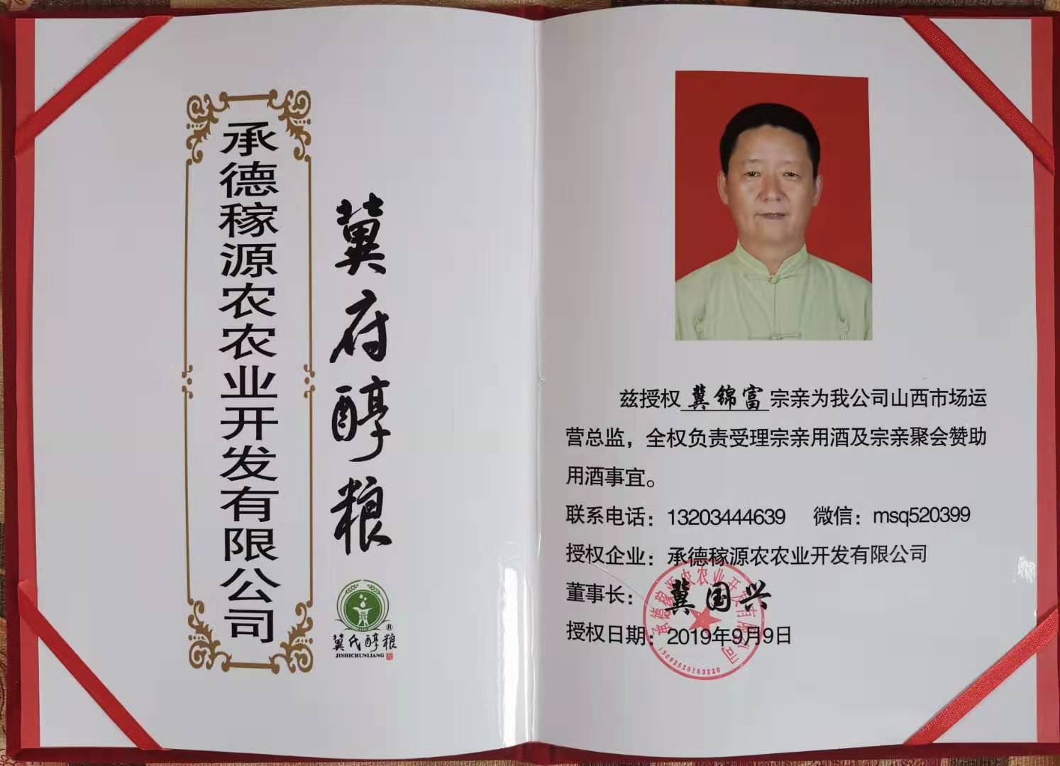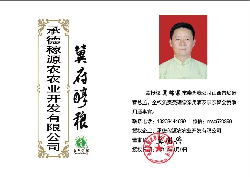 公司公告(一號(hào)):2019年9月9日,已授權(quán)山西省介休市冀錦富宗親,為我公司在山西省的市場(chǎng)運(yùn)營(yíng)總監(jiān),全權(quán)負(fù)責(zé)受理山西宗親用酒及宗親聚會(huì)贊助用酒事宜。特此公告!