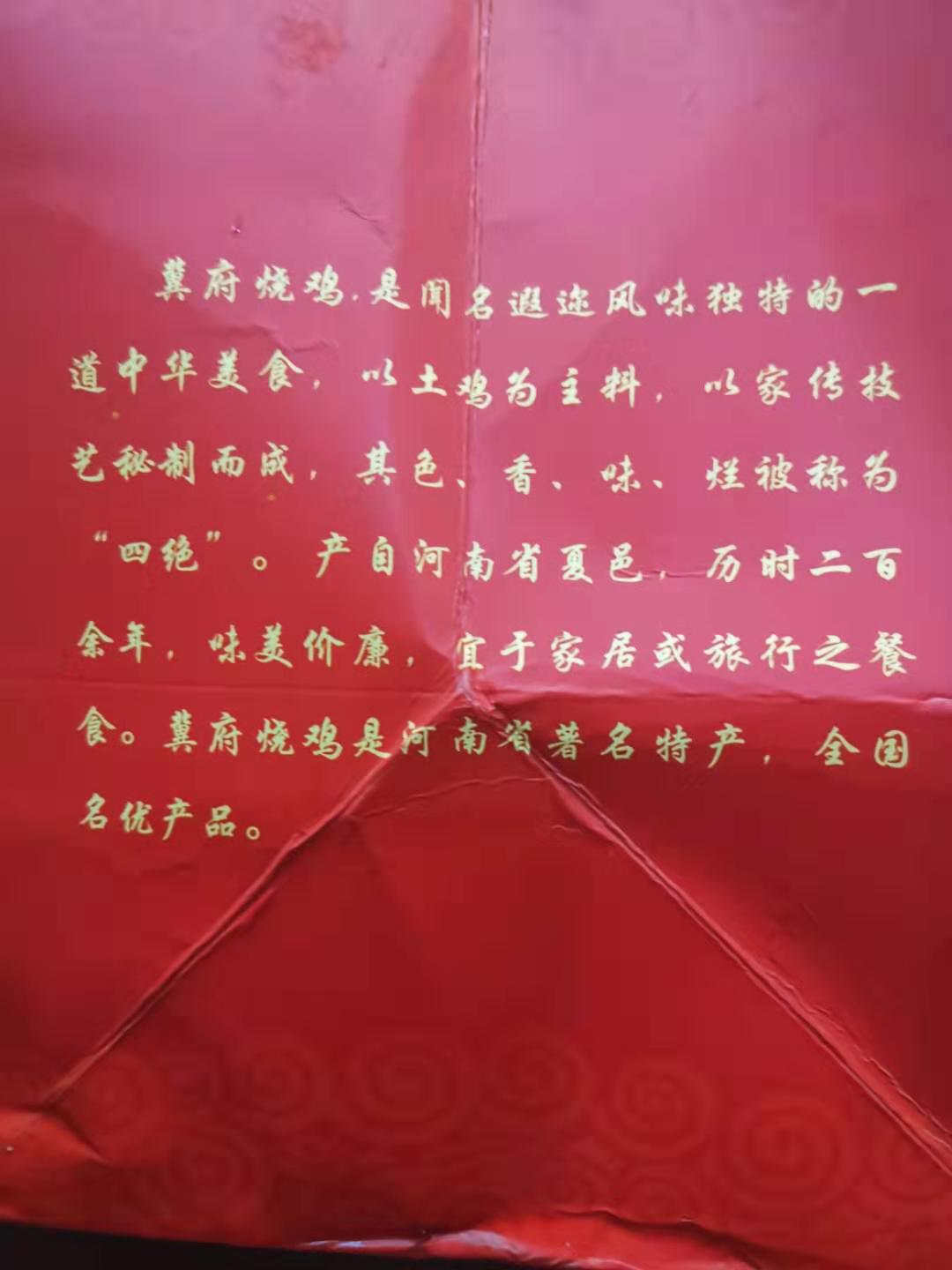 “冀府燒雞”是由河南洛陽冀偉,以祖?zhèn)骷妓嚸刂贫?。該燒雞以當(dāng)?shù)赝岭u為原料,各種中藥材配料腌制,具有色、香、味、爛“四絕”特色。
