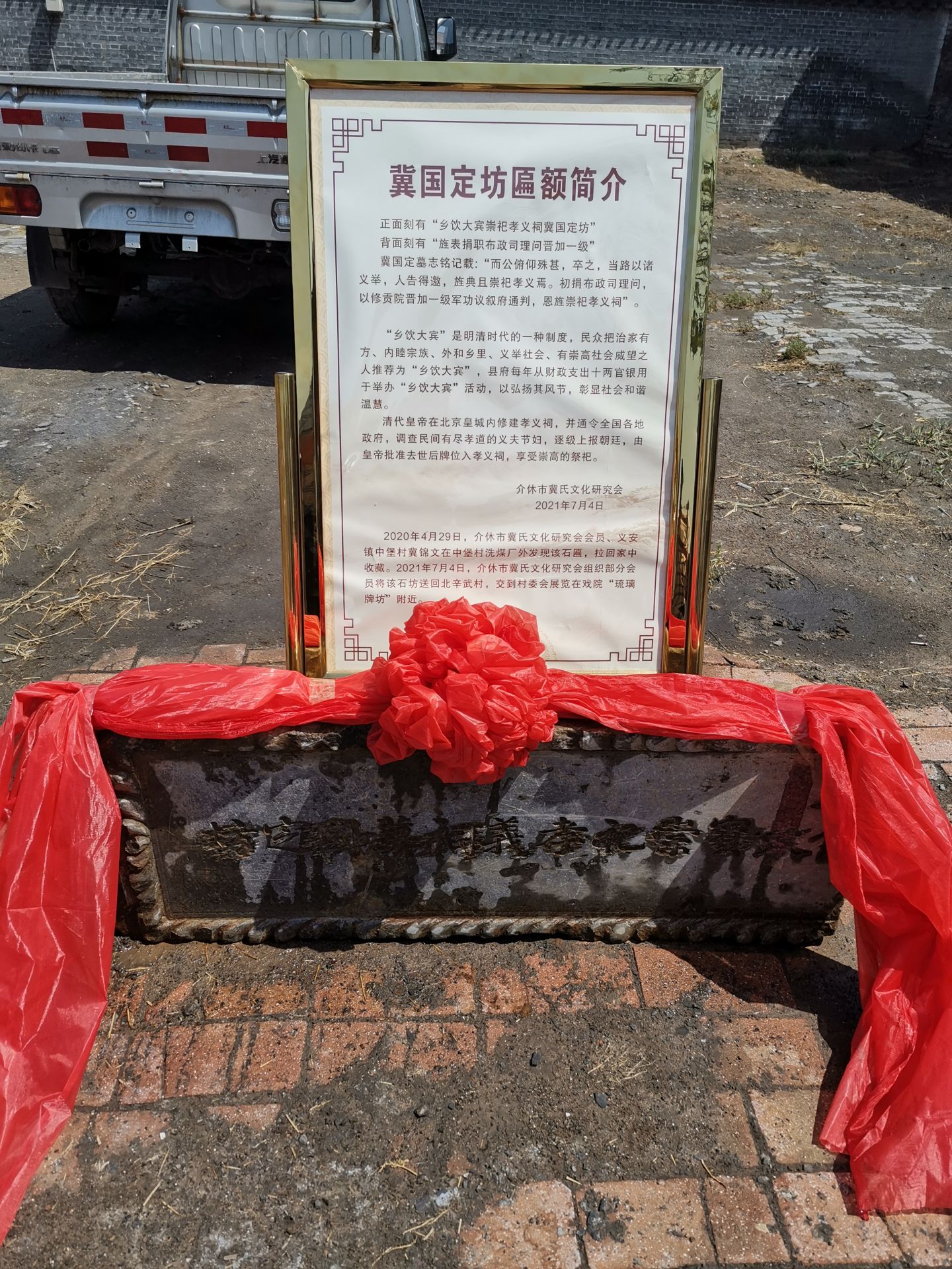 2021年7月4日上午,這天陽(yáng)光燦爛,介休市冀氏文化研究會(huì)提前約好了北辛武村委領(lǐng)導(dǎo)和石匾收藏者中堡村冀錦文先生,組織會(huì)員20余人從中堡村護(hù)送“冀國(guó)定坊匾額”回到原所在地北辛武村,完璧歸趙,圓滿移交到北辛武村委會(huì)。