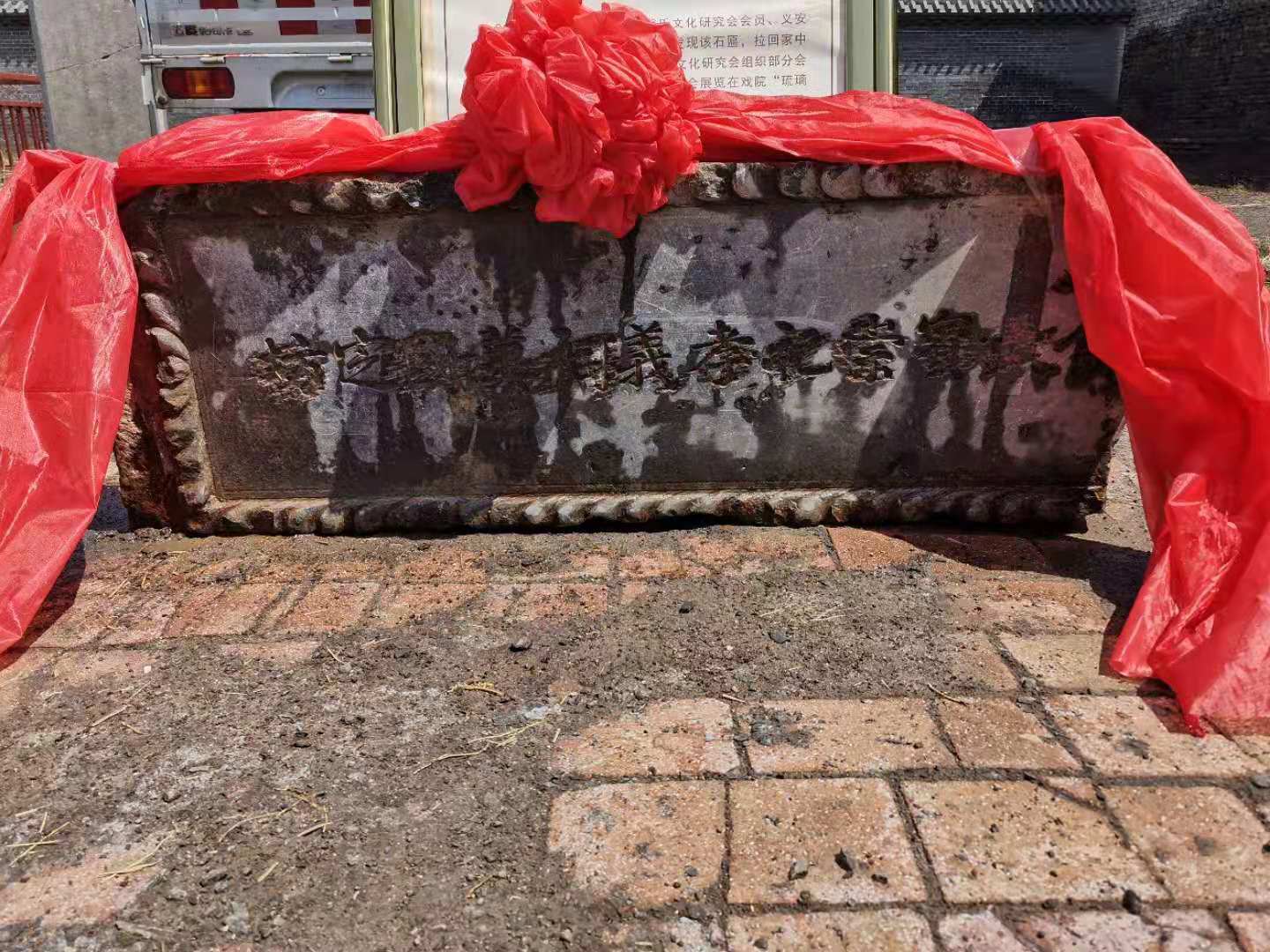 介休市冀氏文化研究會(huì)成員在中堡村將石匾清洗干凈,裝以紅色大繡球,連同書(shū)寫(xiě)好的“冀國(guó)定坊匾額”簡(jiǎn)介,一起運(yùn)到北辛武村,在村戲院移交到了北辛武村委領(lǐng)導(dǎo)之手。黨支部書(shū)記冀廣海、村委主任冀逢益等村委人員熱情接受!