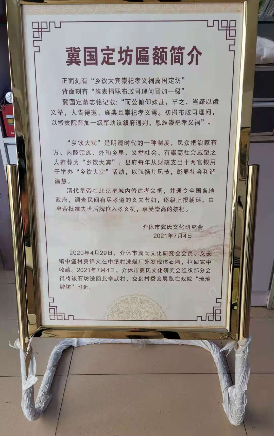 2020年4月29日,介休市冀氏文化研究會(huì)會(huì)員、義安鎮(zhèn)中堡村村民冀錦文,在去自己家農(nóng)田干活的途中,路經(jīng)一洗煤廠外,在外倒的垃圾中發(fā)現(xiàn)一石板,擦試后發(fā)現(xiàn)刻有“冀國(guó)定”字。冀錦文隨即給冀氏文化研究會(huì)秘書(shū)長(zhǎng)冀錦富通了電話,予以匯報(bào)。冀錦富立即驅(qū)車(chē)前往中堡村察看,經(jīng)過(guò)清洗干凈后發(fā)現(xiàn),石板正面刻有“鄉(xiāng)飲大賓崇祀孝義祠冀國(guó)定坊”,背面刻有“旌表捐職布政司理問(wèn)晉加一級(jí)”,長(zhǎng)150厘米(缺30厘米),寬40厘米,石板厚13厘米,實(shí)屬難得的“晉商冀家”物證。