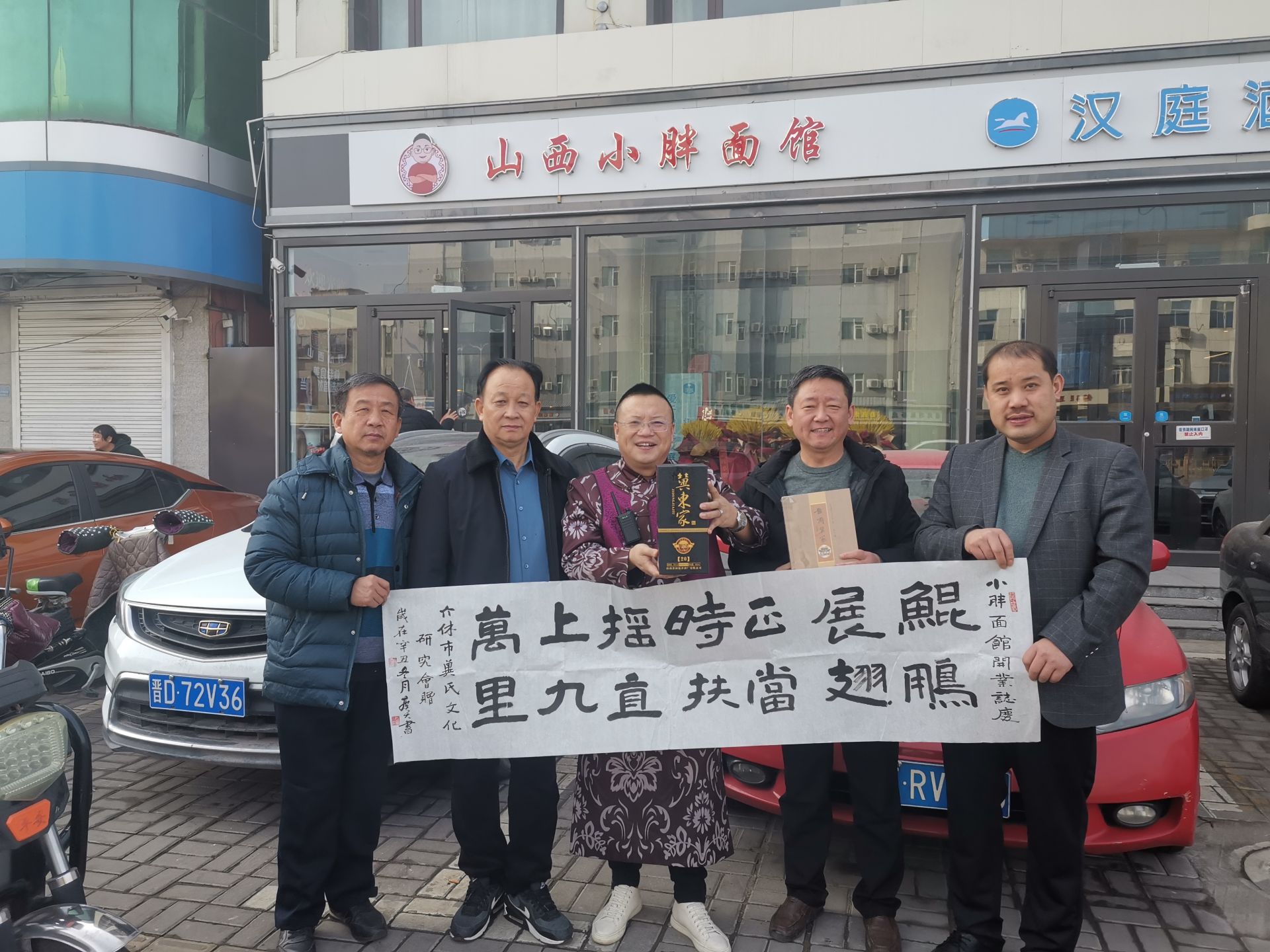 介休市冀氏文化研究會領(lǐng)導(dǎo)得知后,于2021年12月11日,會長冀廣大、秘書長冀錦富、副會長冀耀棟、副秘書長冀少俊一行四人,前往榆次走訪“山西小胖面館”,并為面館贈送了《晉商冀家》圖書、書法字畫、“冀東家”白酒。